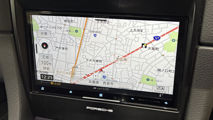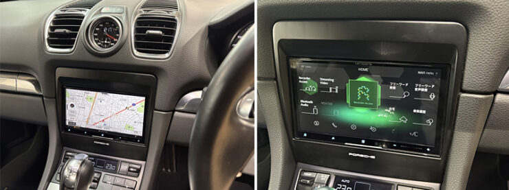 ナビ本体は最新モデルながら、ポルシェ純正のナビフレームを流用してインストールしています。社外品をつけた際の「浮いた感じ」がなく、見た目も非常にスッキリ。